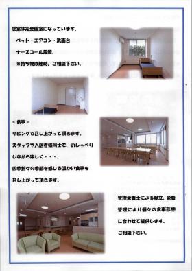 必須ですが、日常業務としての入浴介助やトイレ介助はほぼ なく、必要な方は外部の介護サービスを利用されます。 入居者の自主性を尊重し、季節に応じたイベントや、趣味活動等 で入居者の生活に彩を添えています。 開放的でアットホームな施設です。 | ||